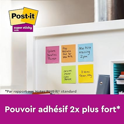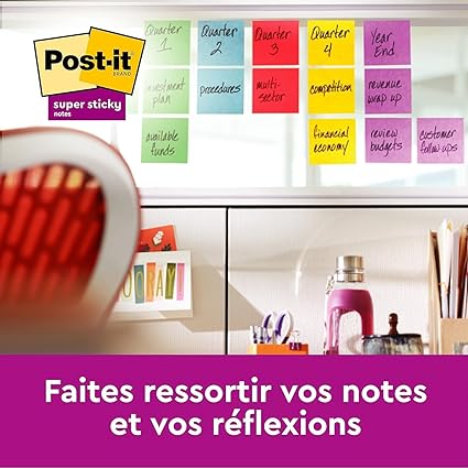 Bloc-notes autocollants Post-it 76×76 mm, idéal pour des rappels et des notes rapides. Repositionnables et disponibles en couleurs vives.